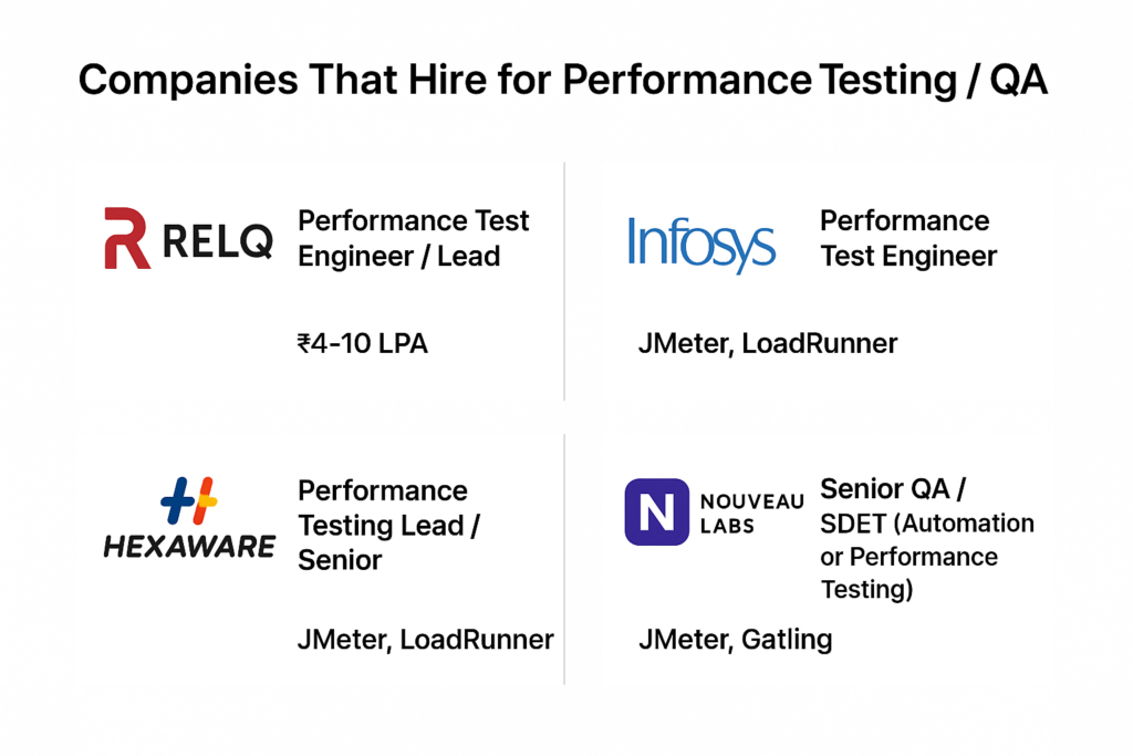 Below are some real companies that post performance-testing / JMeter-oriented roles in India (or have significant QA / Performance Engineering teams), what they typically expect, and what the salary trends look like: