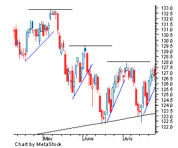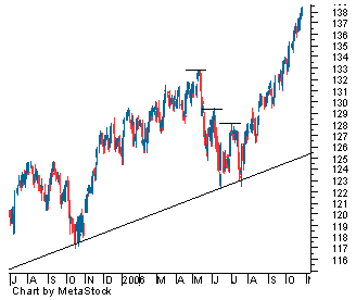 Uptrend: Market is said to be in upward trend when each peak in a rally reaches higher level than the previous rally’s peak and each low in the rally must be higher than the previous rally’s low.