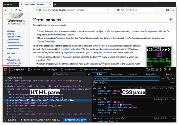 In Mozilla Firefox, the Web developer option under Tools menu, offers various tools for web development and testing. For inspecting the elements, the inspector tool is used to examine and modify the HTML and CSS of a page. There are two main ways to open the Inspector